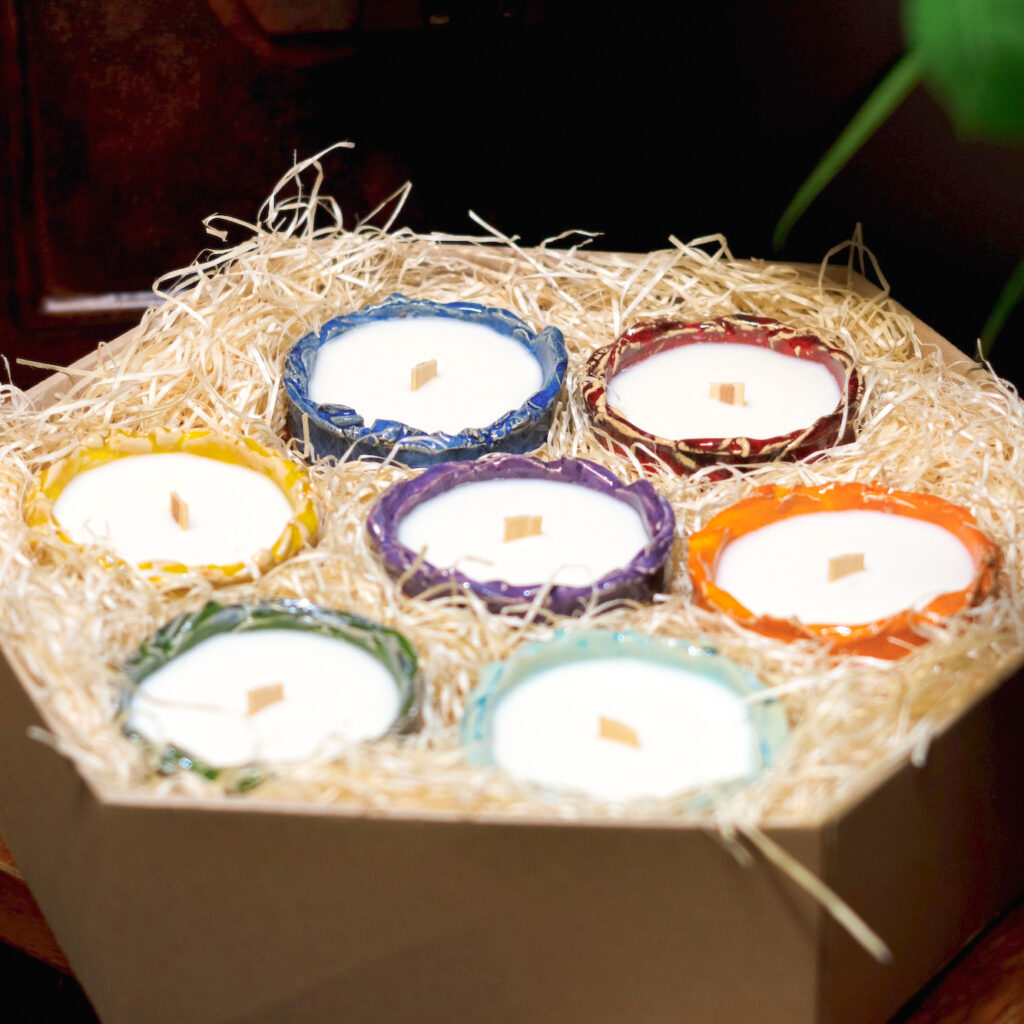 Specjalnie zaprojektowane ceramiczne naczynie, tworzone z pasją. Inspirowane naturą. Wypełnione naturalnym 100% woskiem sojowym i drewnianym, skwierczącym knotem, którego dźwięk wprowadza nas w głęboki stan relaksu i medytacji. Nasze świece spalają się ok. 3 razy dłużej niż parafina, nie kopcą i wydzielają śladowe ilości dwutlenku węgla.